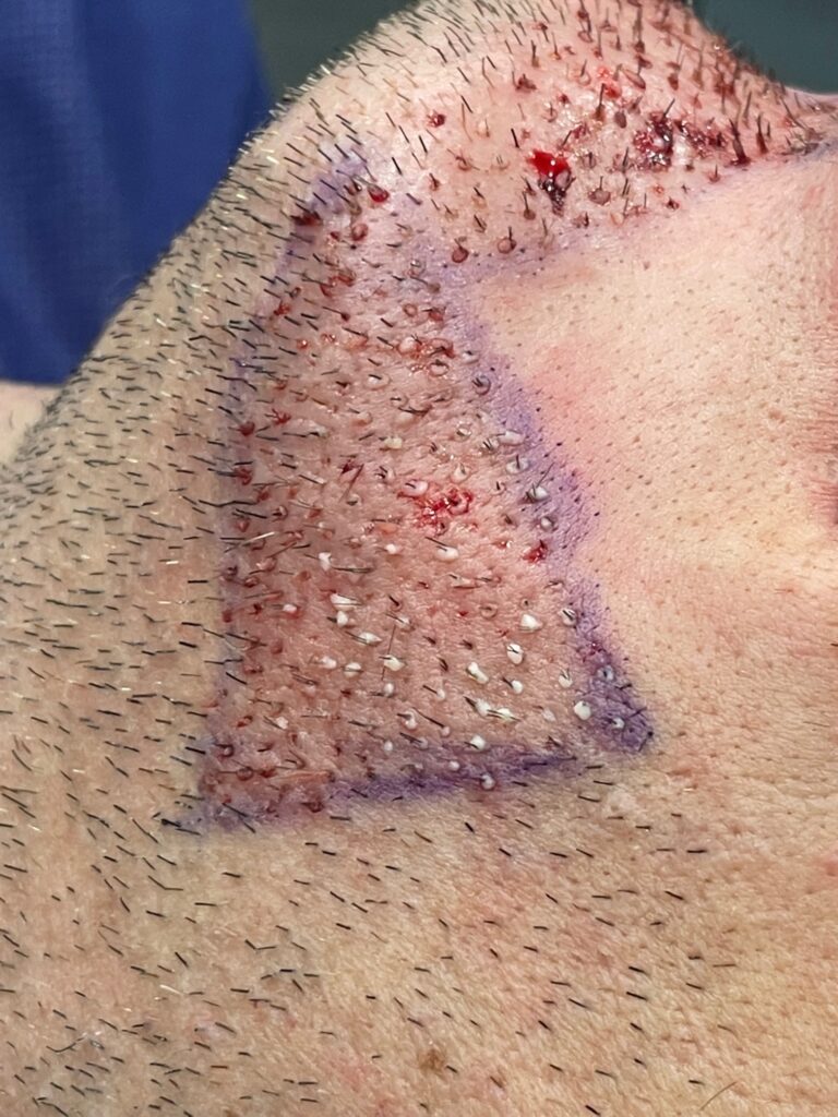• Le patient peut également ressentir quelques démangeaisons et avoir des rougeurs. Des petites croûtes se forment sur les greffons et mettront plusieurs jours pour s’éliminer (ce qui peut nécessiter une éviction sociale temporaire). Les greffons implantés vont tomber avec les croûtes après cinq à sept jours.